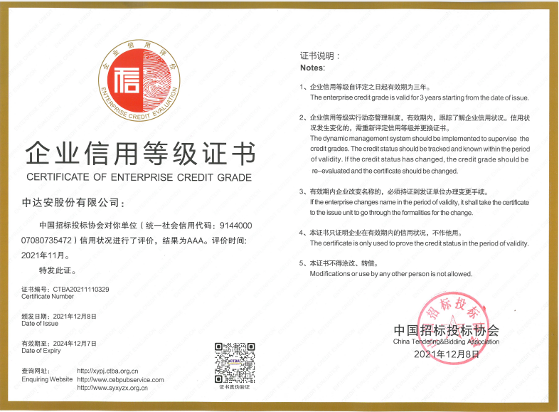中國招標投標協(xié)會企業(yè)信用等級證書AAA