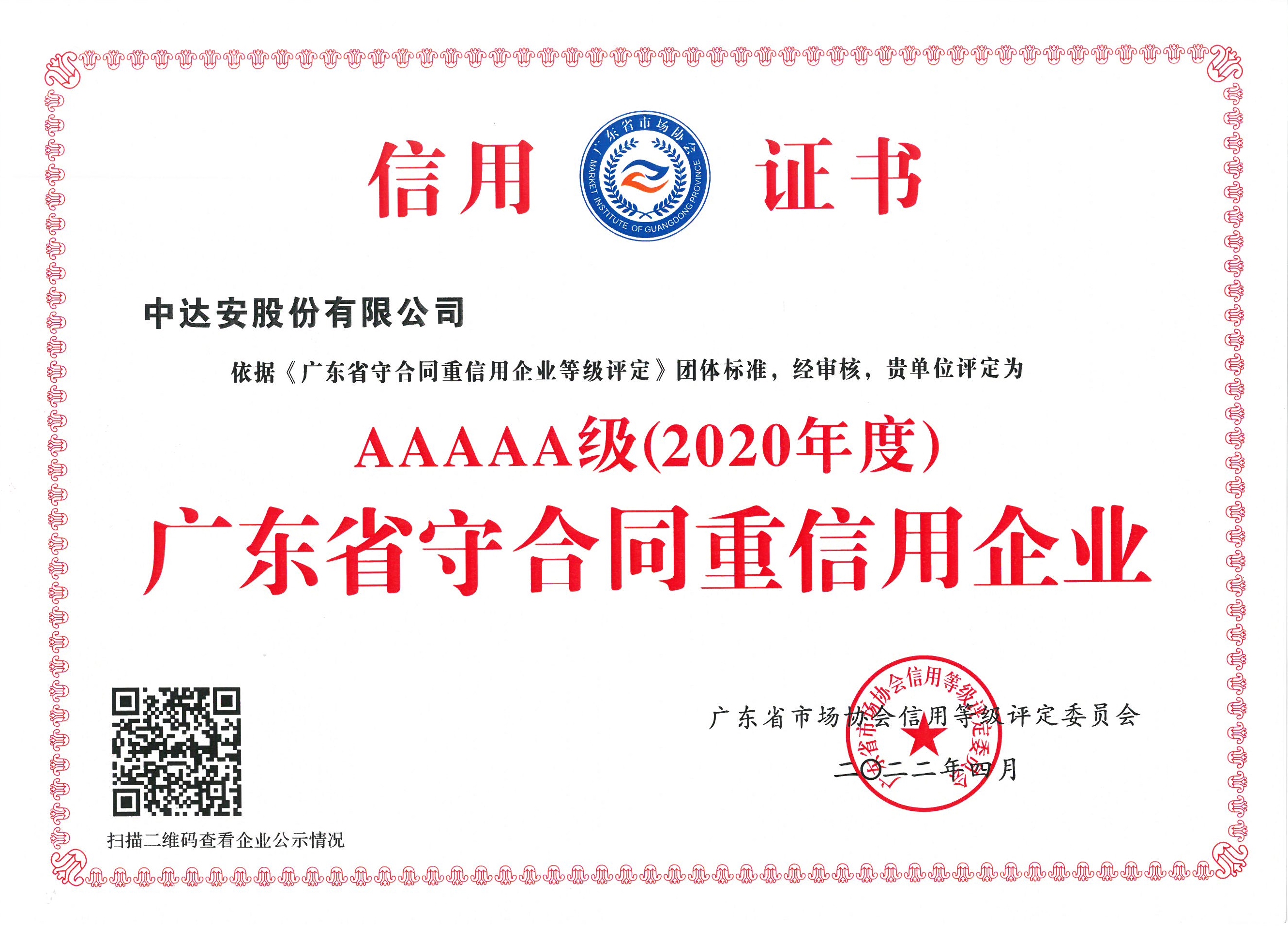 “AAAAA級(2020年度)廣東省守合同重信用企業(yè)”信用證書