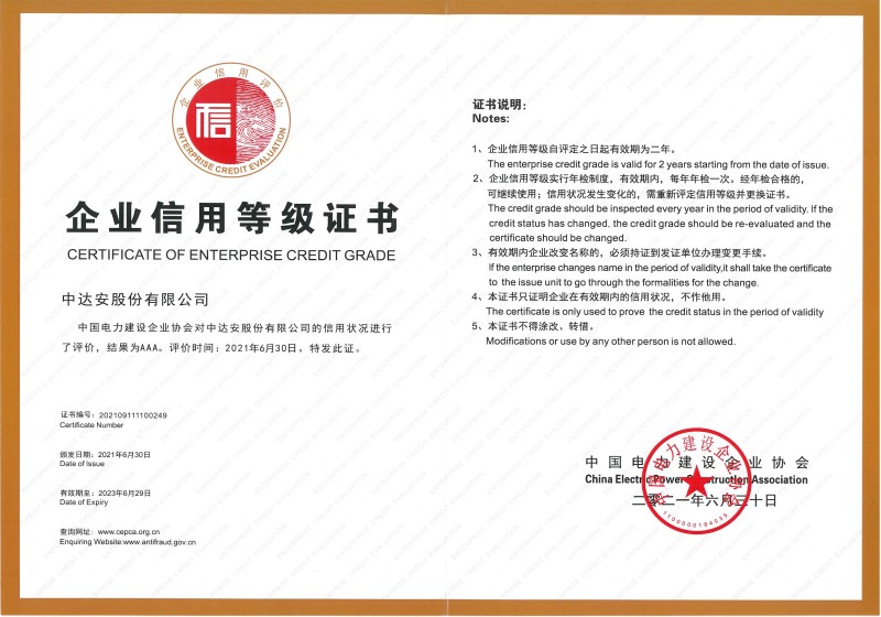 中國電力建設(shè)企業(yè)協(xié)會企業(yè)信用等級證書AAA級