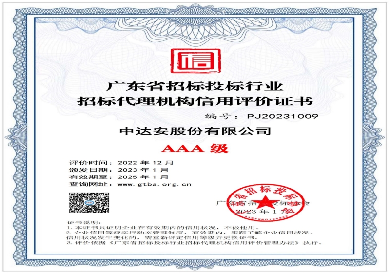 廣東省招標投標行業(yè)招標代理機構(gòu)信用評價AAA級證書