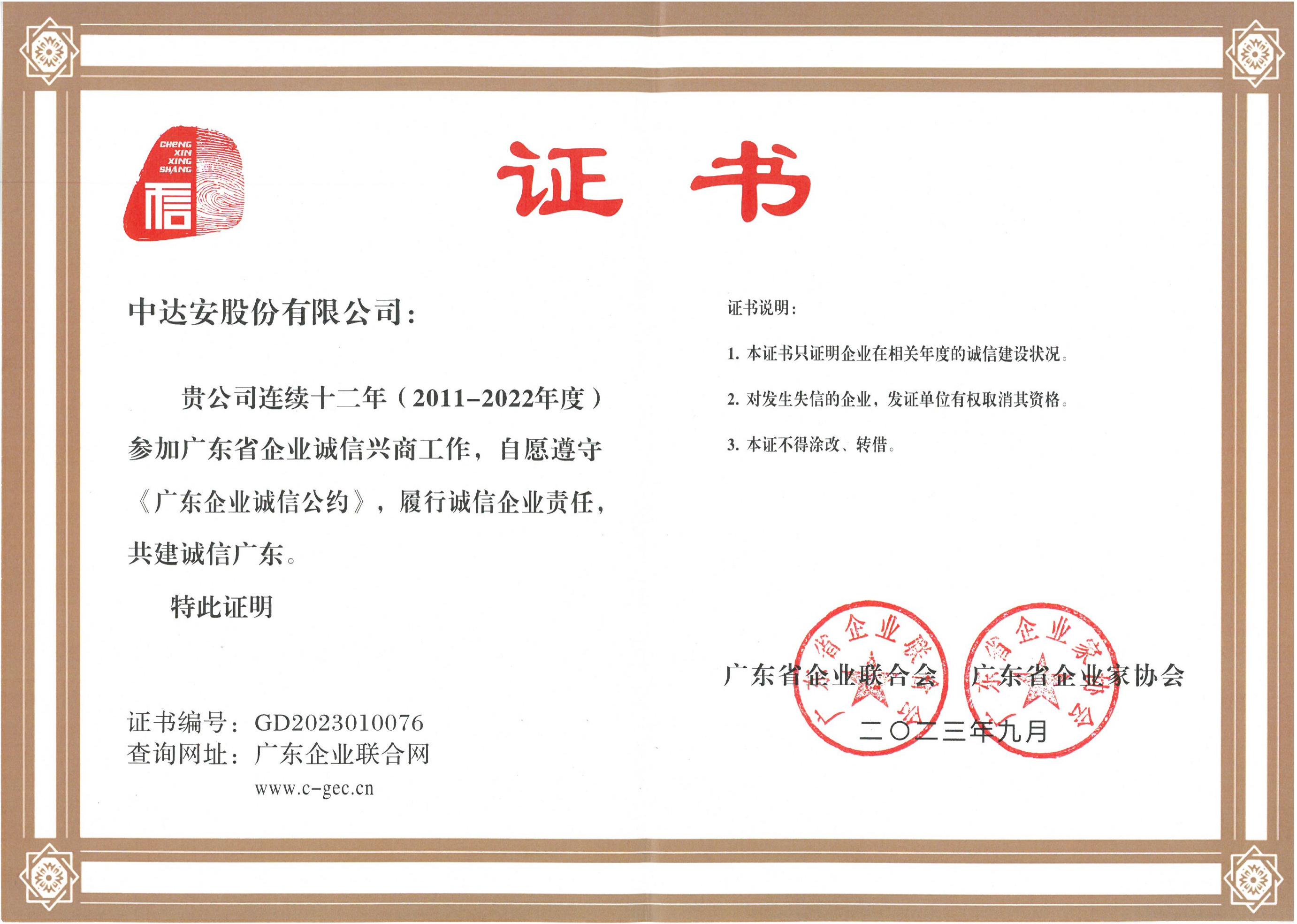 連續(xù)十二年(2011年度-2022年度)廣東省企業(yè)誠信興商證書