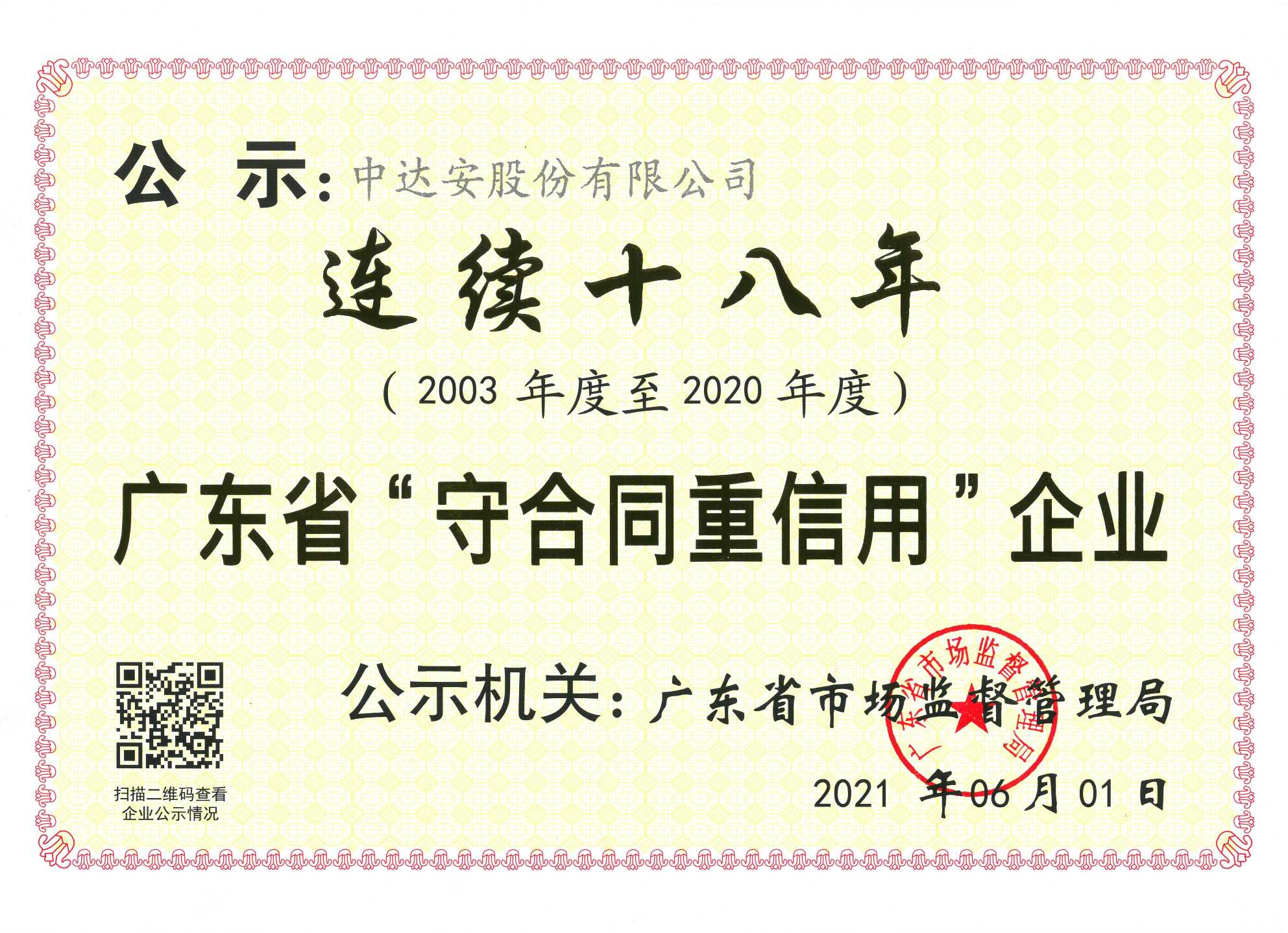 連續(xù)十八年(2003年度至2020年度)廣東省“守合同重信用”企業(yè)